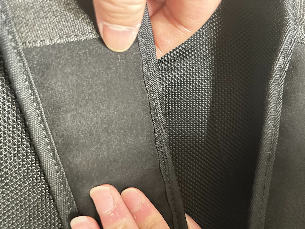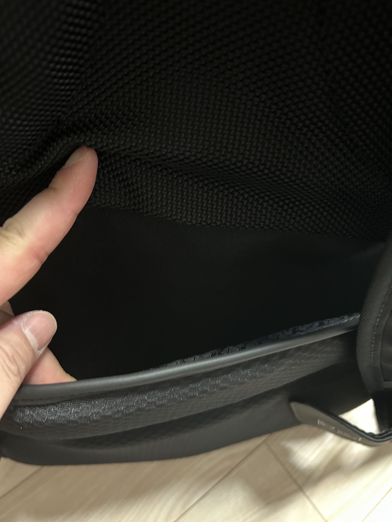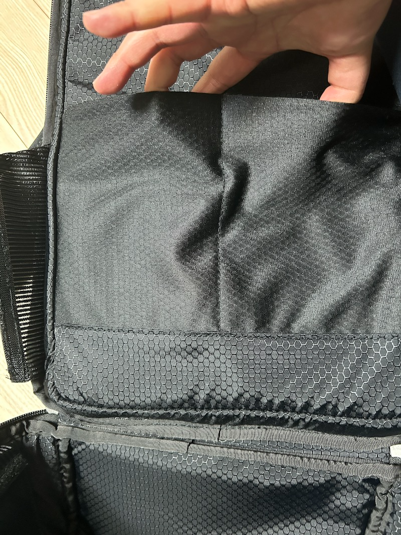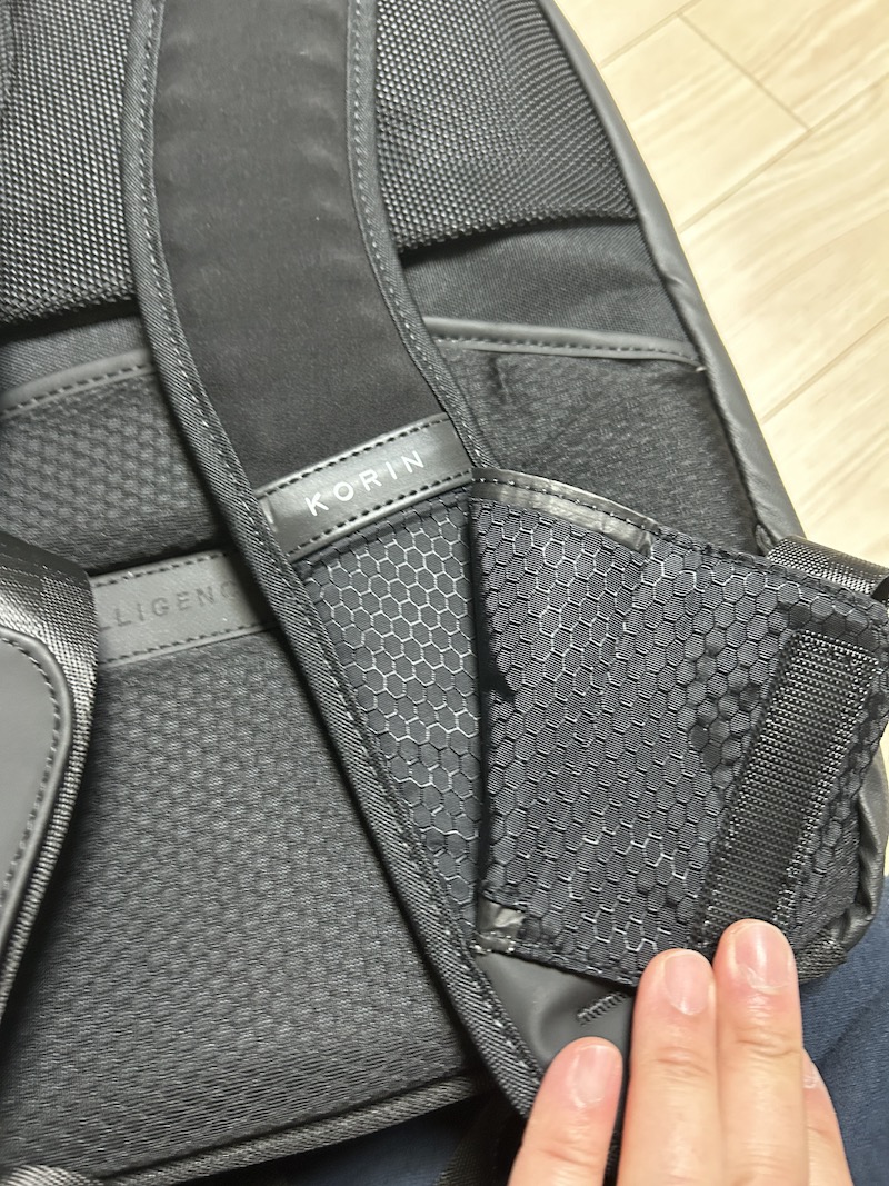 등쪽에도 아래처럼 히든 스페이스가 있고, 캐릭어 손잡이?에 걸수 있도록 가로로 벨트가 숨어 있어서 캐리어에 연결하고 싶은데만 꺼내쓰면 될거 같아요. 그리고 어깨쪽, 허리쪽에도 쿠션이 어느 정도 들어가 있어요.