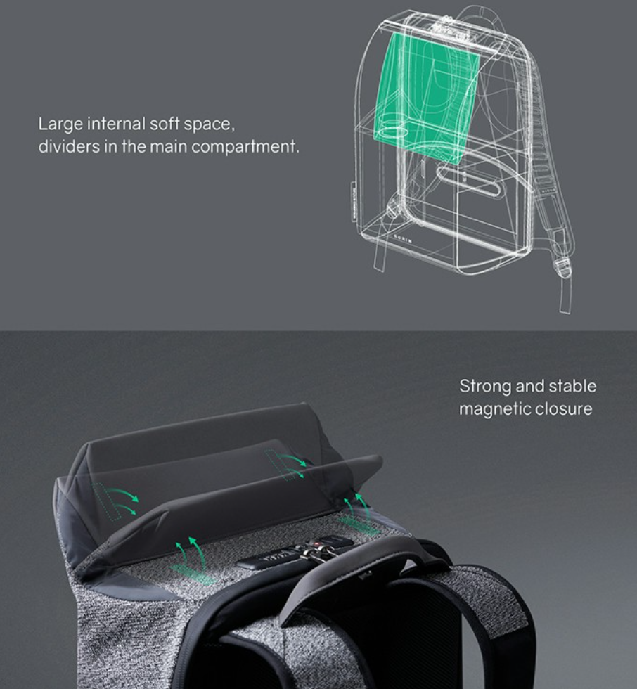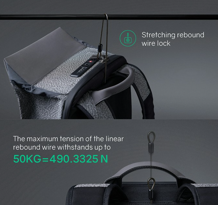 기본적인 가방 외관 디자인은 아래와 같은데, 와이어가 들어있는 절단 방지 초강력 원단이라 칼에도 잘 찢어지지 않는다고 하네요. 실제로 테스트해보지는 못하겠네요. ㅎ