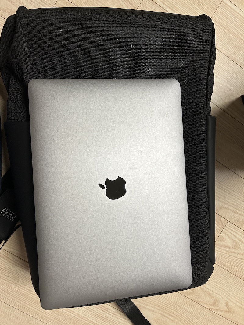 제 맥북에어 13인치를 가방 위에 올려봤는데, 생각보다 가방이 크네요.