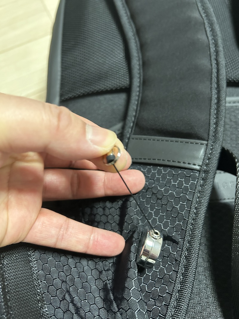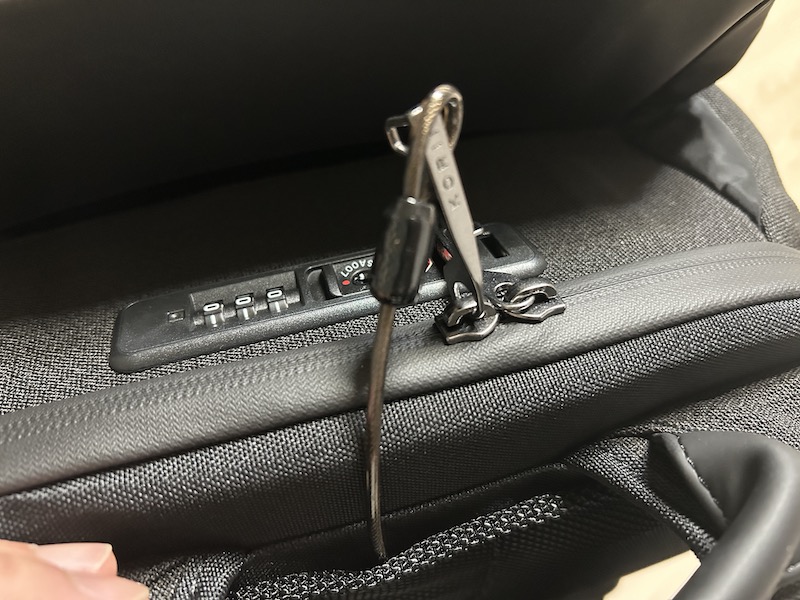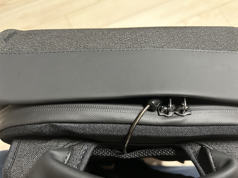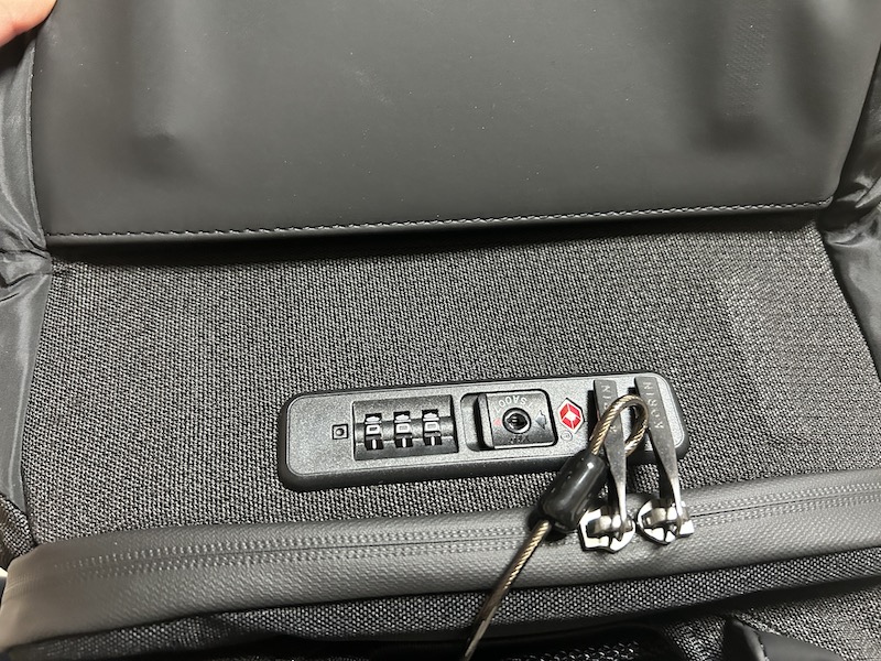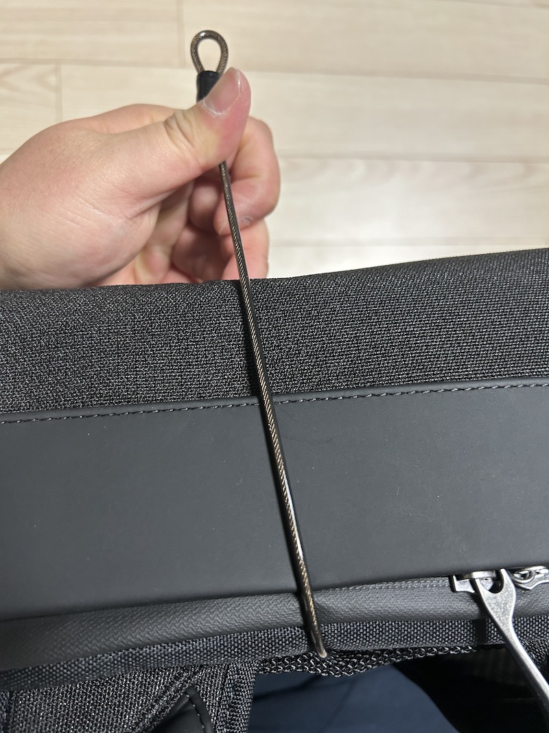 가방 위쪽에는 TSA 락과 함께 도난방지 와이어가 있어, 가방을 잠근다든지, 또는 의자등에 와이어를 tsa락에 연결하여 묶어둔다든지 할 수 있네요. 실제로 유럽 출장에서 동료가 조식 먹으러 가방을 의자 밑에 두고 음식 가질러 갔다가 왔는데 그 사이 가방을 도난 당한 적도 있어서 이 기능이 아주 유용할 거 같아요.