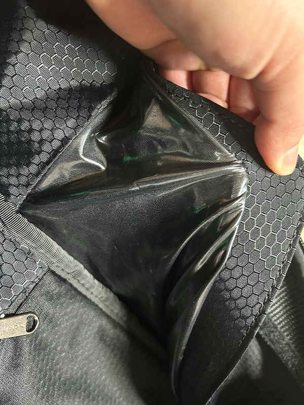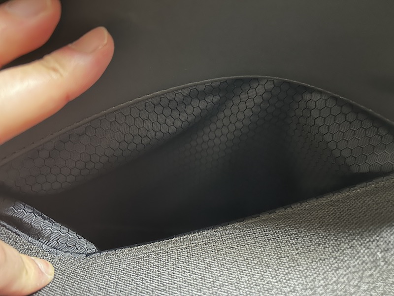 반대편 쪽은 밖에서 접이식 우산이나 물통,텀블러등을 넣을 수 있는 히든 스페이스가 있습니다. 아래 이미지처럼 외부에서 텀블러를 넣으면 안쪽 공간으로 들어가고 마그네틱으로 닫혀서 외관적으로 티가 안 나요. 그리고 안쪽 안감은 방수 재질이네요.