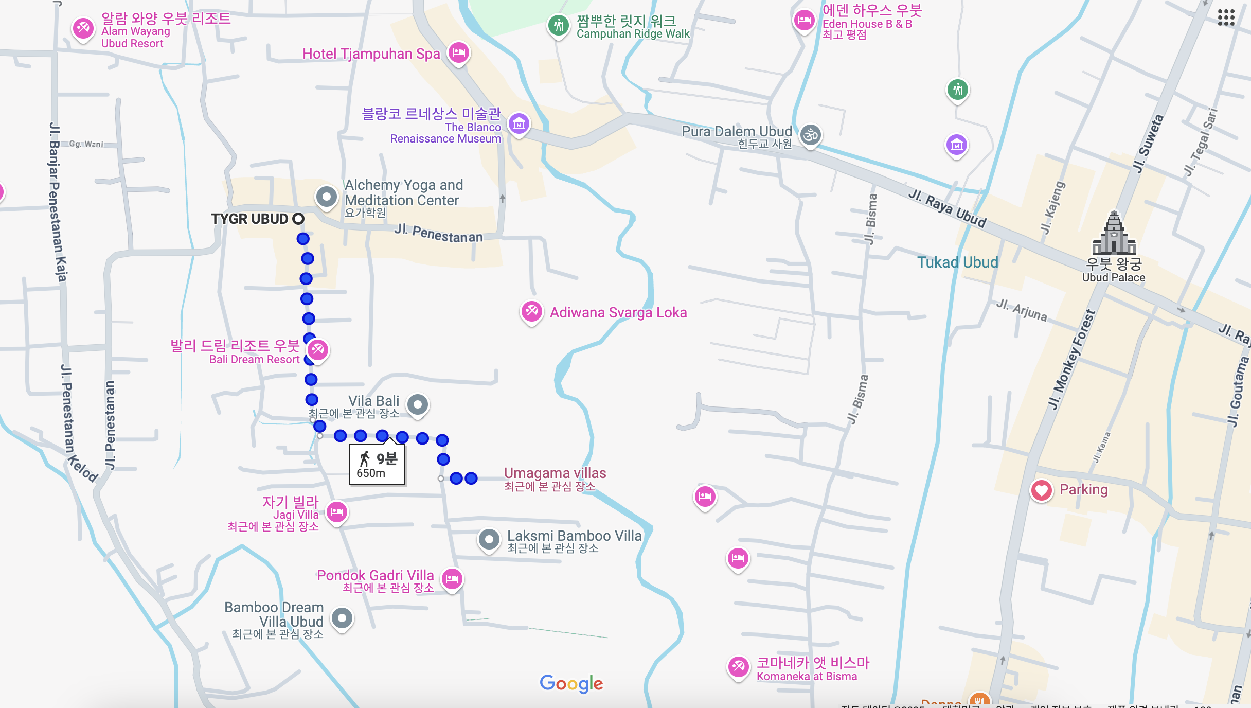 아래 TYGR UBUD(일식 레스토랑)까지는 큰 도로로 차로 이동이 가능하지만,