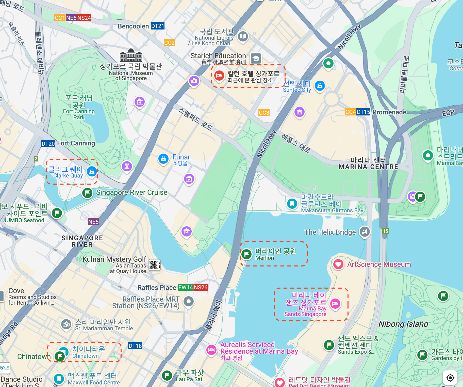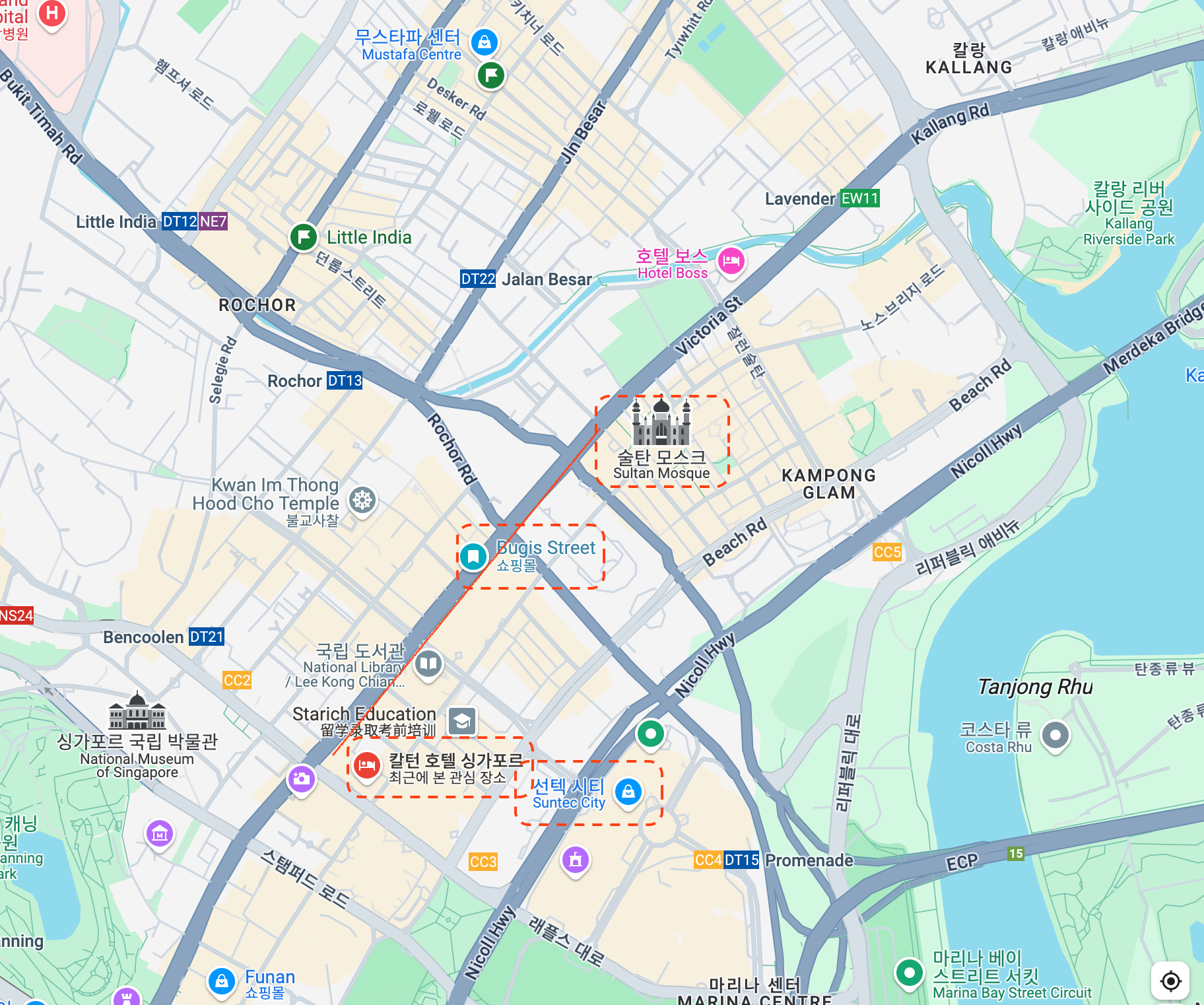 이번에 가려고 하는 부기스, 아랍스트리트, 클락키등과의 거리를 고민했어요