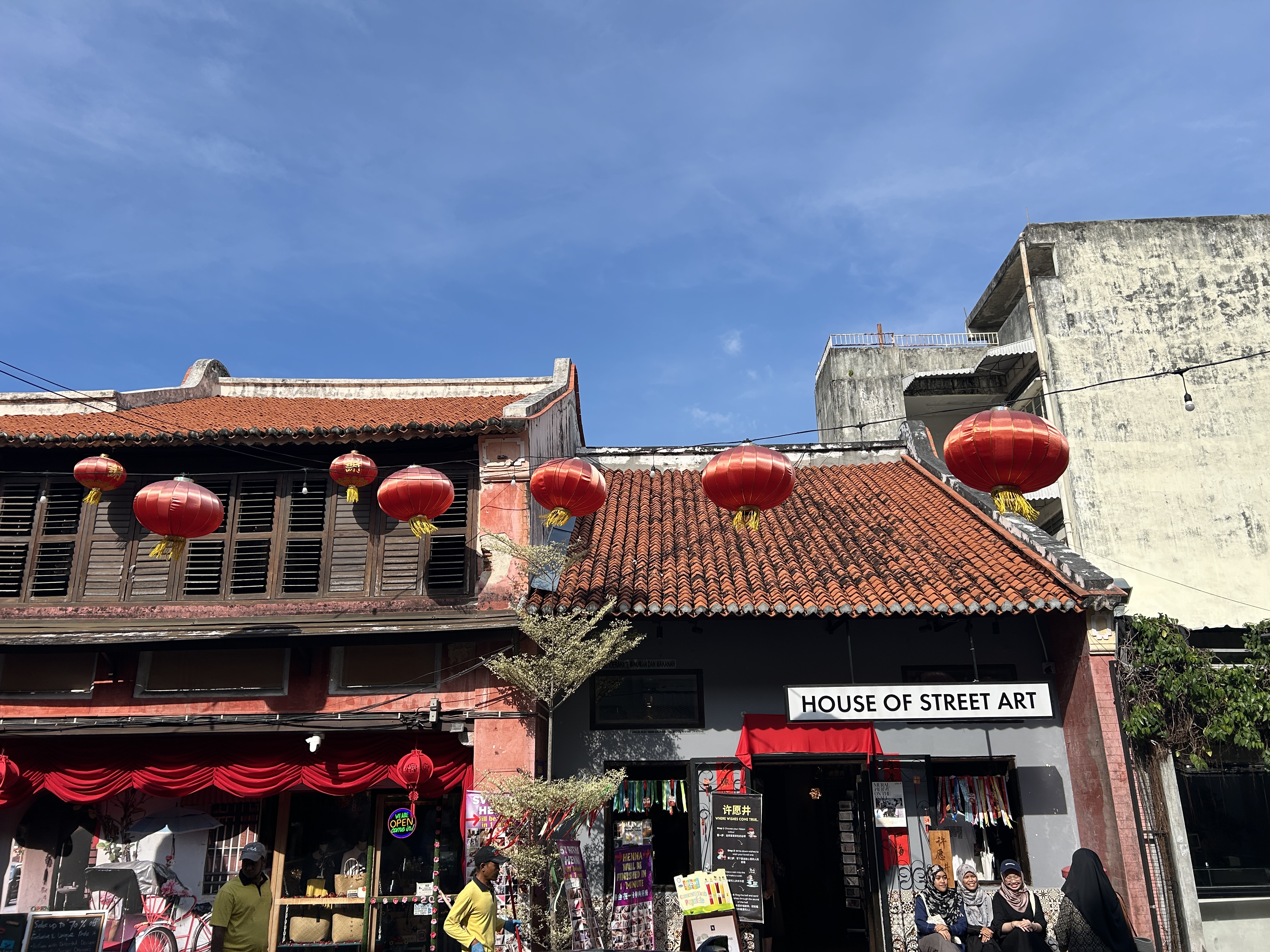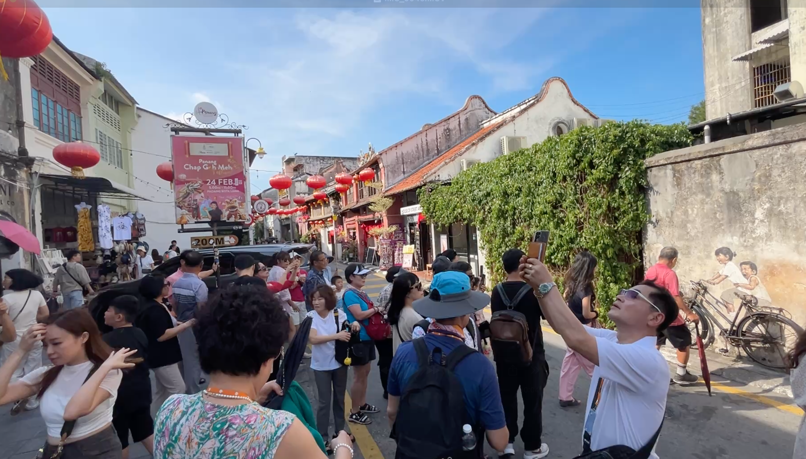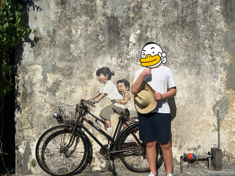 페낭 스트리트 아트에서 아이들이 자전거타는 유면한 벽화앞에는 사람들이 많아요.